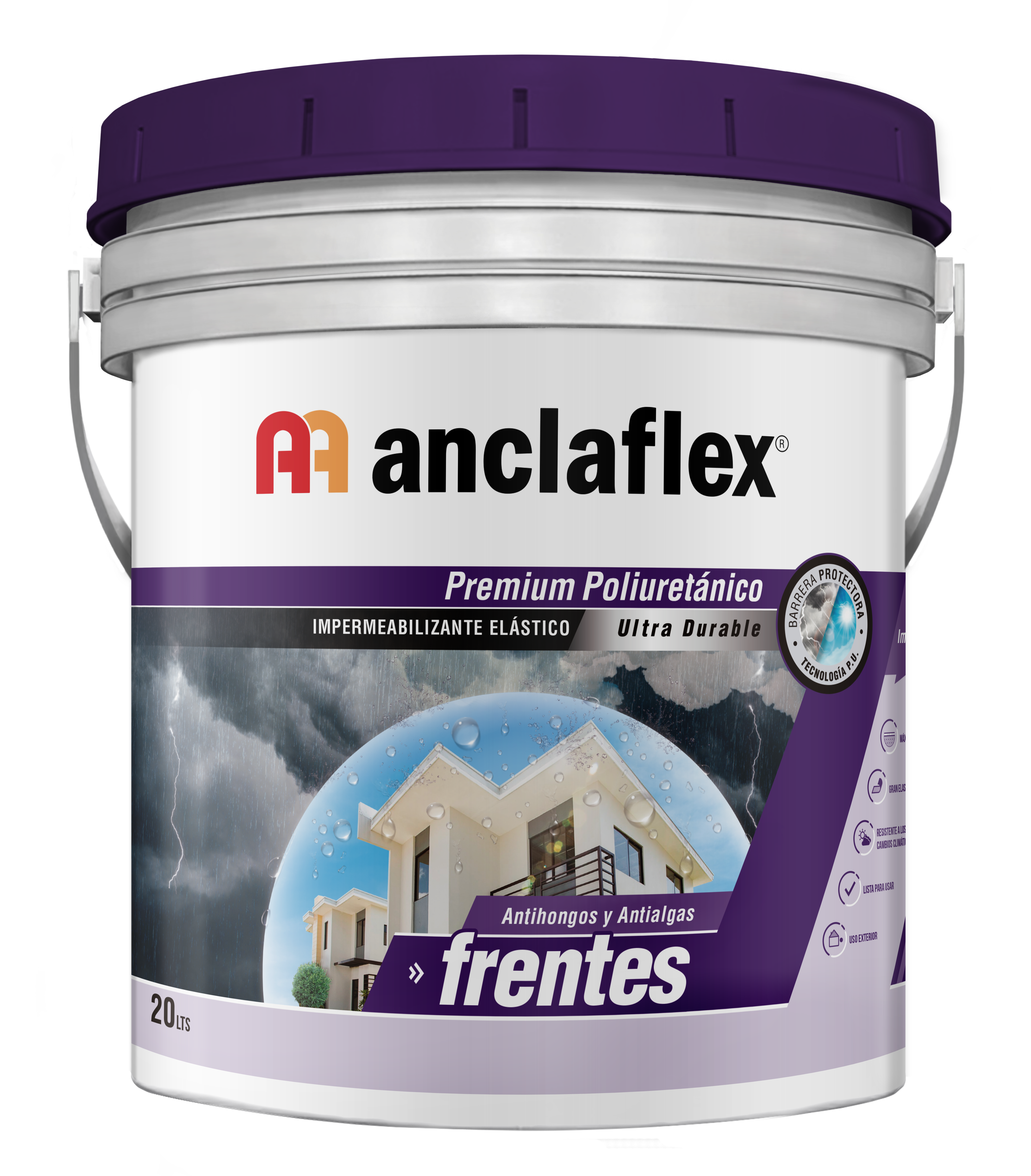 Anclaflex Frentes es un Impermeabilizante elastomérico de base acuosa especialmente formulado a base de polímeros acrílicos y poliuretánicos, tecnología que le confiere al producto una excelente performance brindando mayor resistencia a los cambios climáticos y a la intemperie, mayor flexibilidad y mayor resistencia al agua de lluvia. Su elevada elasticidad le permite acompañar los movimientos estructurales propios de los materiales de la construcción. Al secar forma una película protectora impermeable de ligero brillo rasante, elástica y de gran adherencia, capaz de acompañar el movimiento de pequeñas micro fisuras típicas de los revoques. Apto para ser entonado con Entonador Universal.